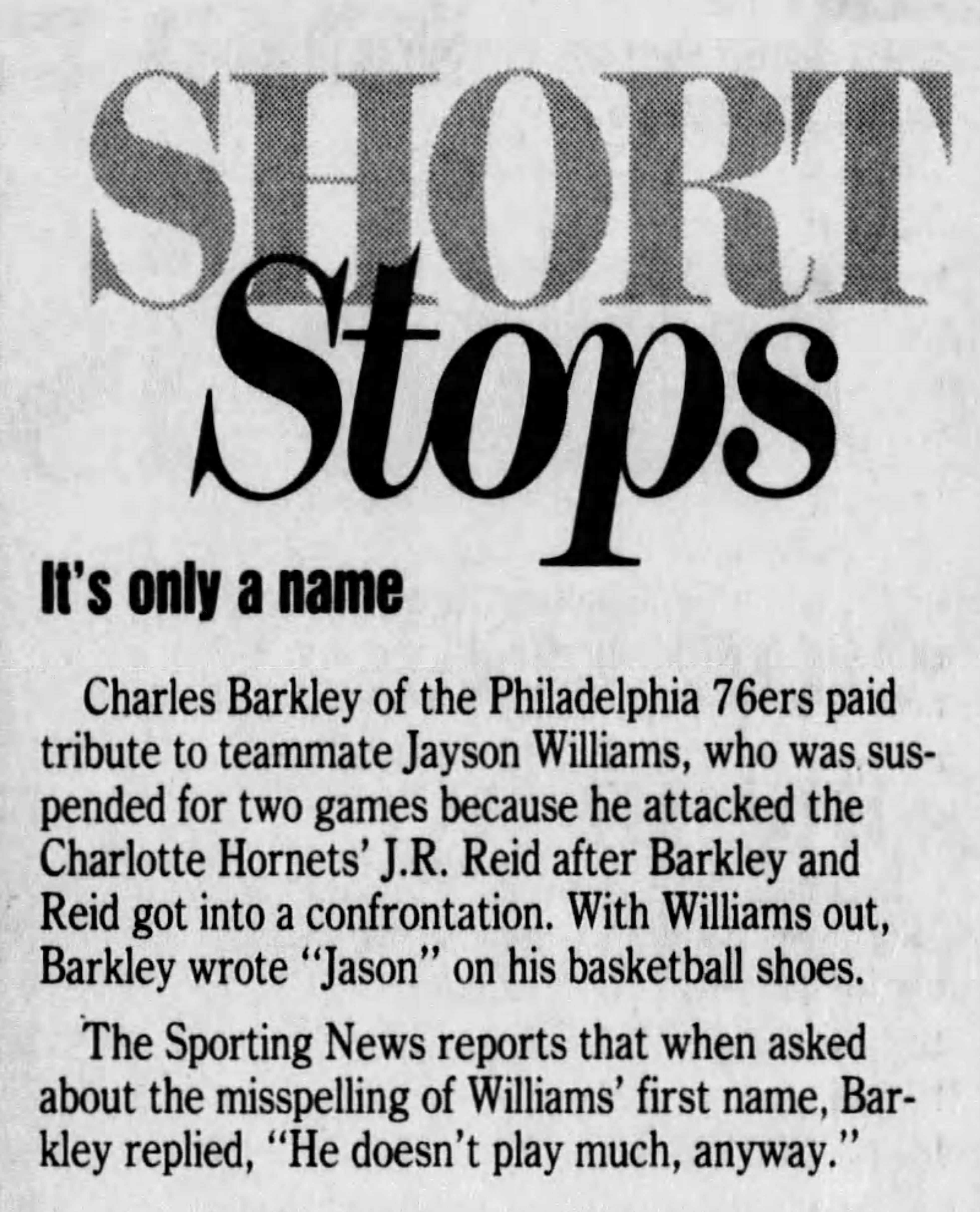 Młody skrzydłowy Sixers dzień później został zawieszony przez ligę na dwa mecze i ukarany grzywną, dlatego Barkley postanowił w kolejnym spotkaniu złożyć mu hołd i wystąpił w butach z napisem „JASON”.